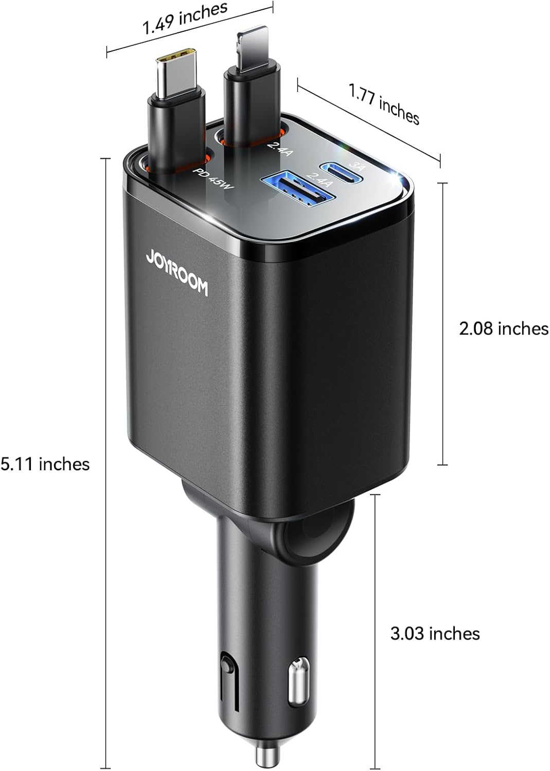Versatile and Powerful 4 Ports Car Charger – JOYROOM 84W Retractable car charger 4 in 1 with USB-C and USB [QC15W+QC12W] ports and 2 multi-functional retractable cables (PD45W+12W) for charging up to 4 devices at the same time. Whether you’re looking for car accessories for men or women, that‘s a nice choice. Makes your car more neat and organized with this smart car organization solution. Smart car charger usb c efficient power distribution ensures full speed charge all your devices without slowing down the charging speed