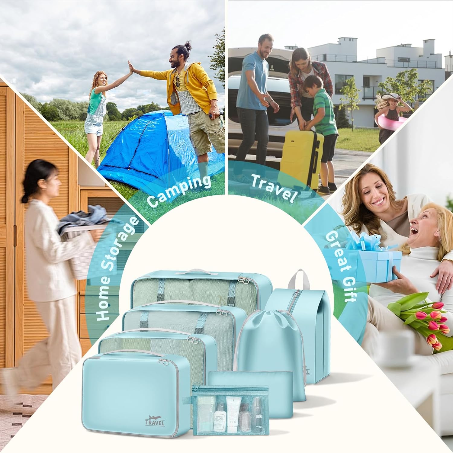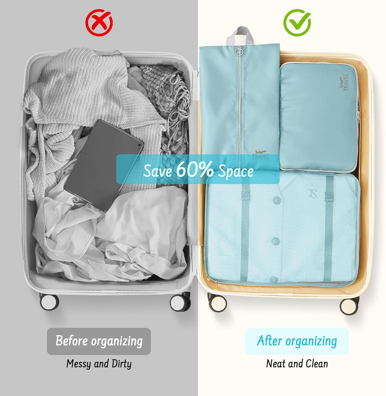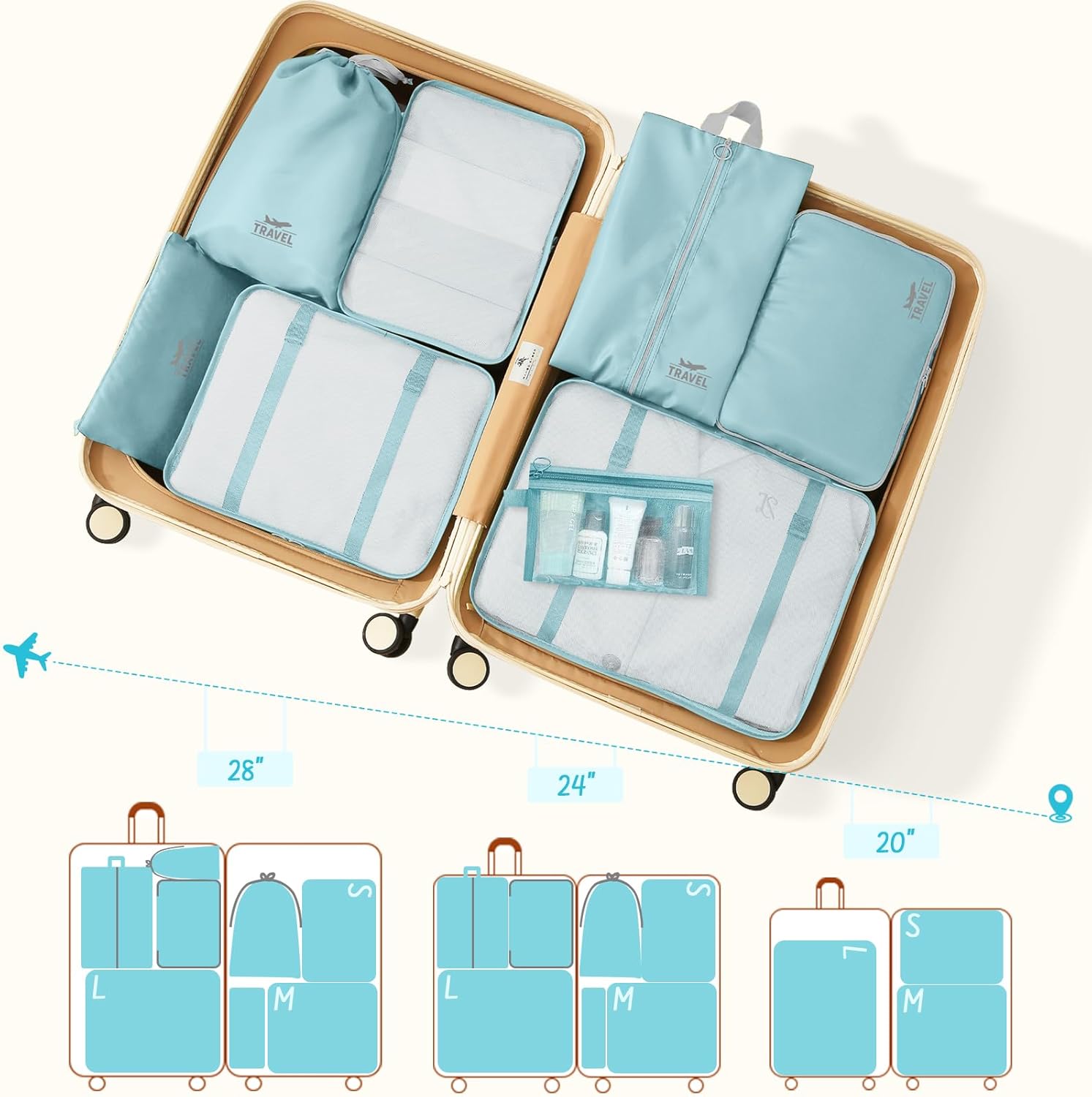 Travel Packing Cubes Set: 8 set travel organizer bags include 3 breathable mesh packing cubes (1 XLarge, 1 Large, 1 Medium ) 1 underwear packing cube, 1 laundry bags, 1 mesh bag, 1 shoe bag, and 1 makeup bag. Effortlessly organize your clothes, toiletries, makeup, shoes, and more for travel. Designed to maximize luggage space and meet all your storage needs.