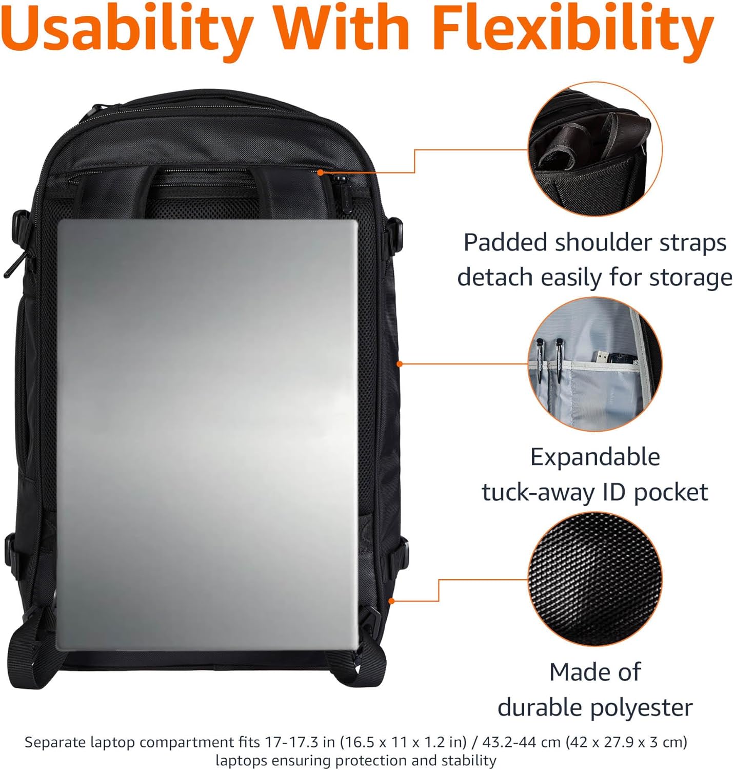 Crafted from durable polyester, this backpack for traveling on airplanes is airline approved and conveniently fits as carry on luggage. The internal zippered laptop sleeve helps your laptop stay secure. The main compartment features a zippered mesh space, optional midway shelf, and compression straps for organized packing. The front and top pockets provide quick access to documents and travel liquids. With expandable storage space and a tuck-away ID pocket, this travel backpack meets your needs. Comfort is prioritized with padded shoulder straps that easily disconnect and stow away, along with a removable sternum strap, waist belt, and shoulder strap for varied carrying options. Exterior dimensions of 21.5 x 15.75 x 8.25 inches offer ample packing room, while the full-expansion zipper allows for an additional 10% packing space.