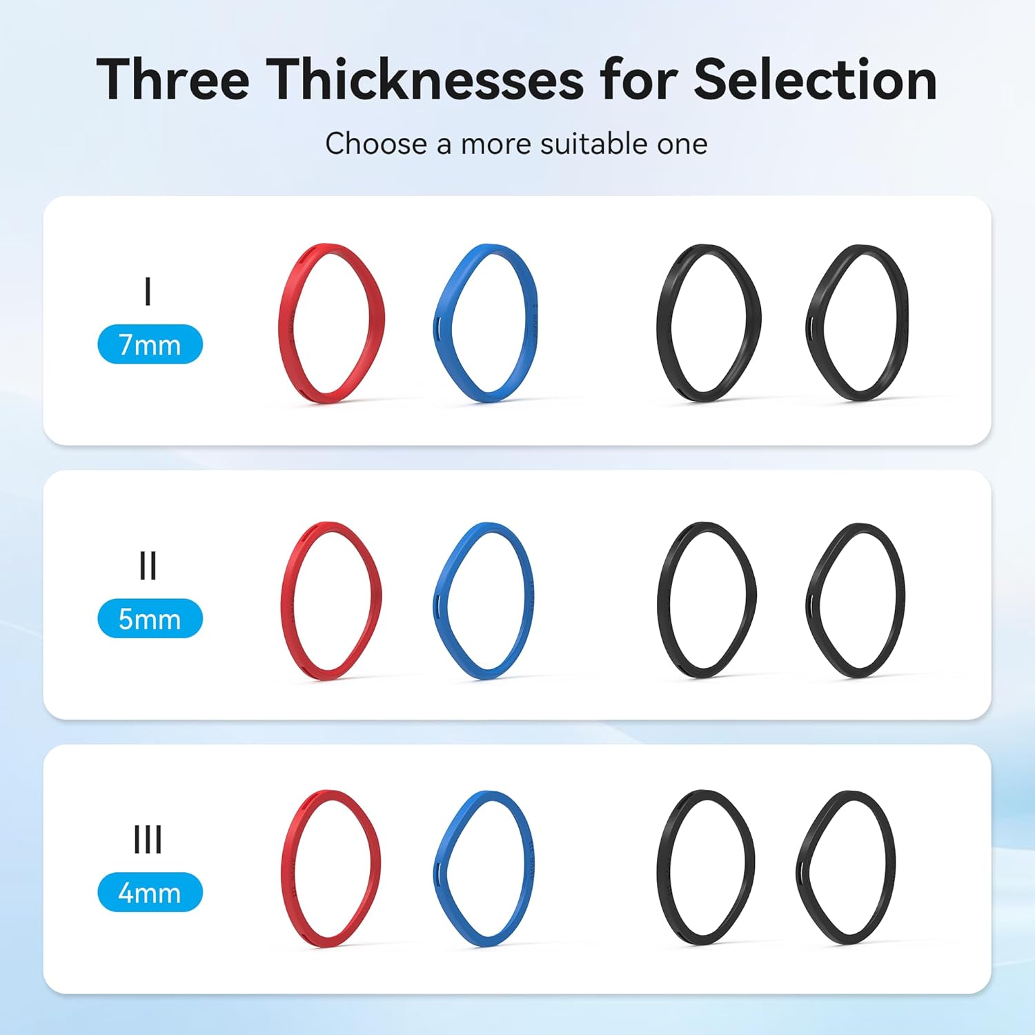 Choose different sizes according to the curvature of your glasses, model ‘I’ is the thickest one