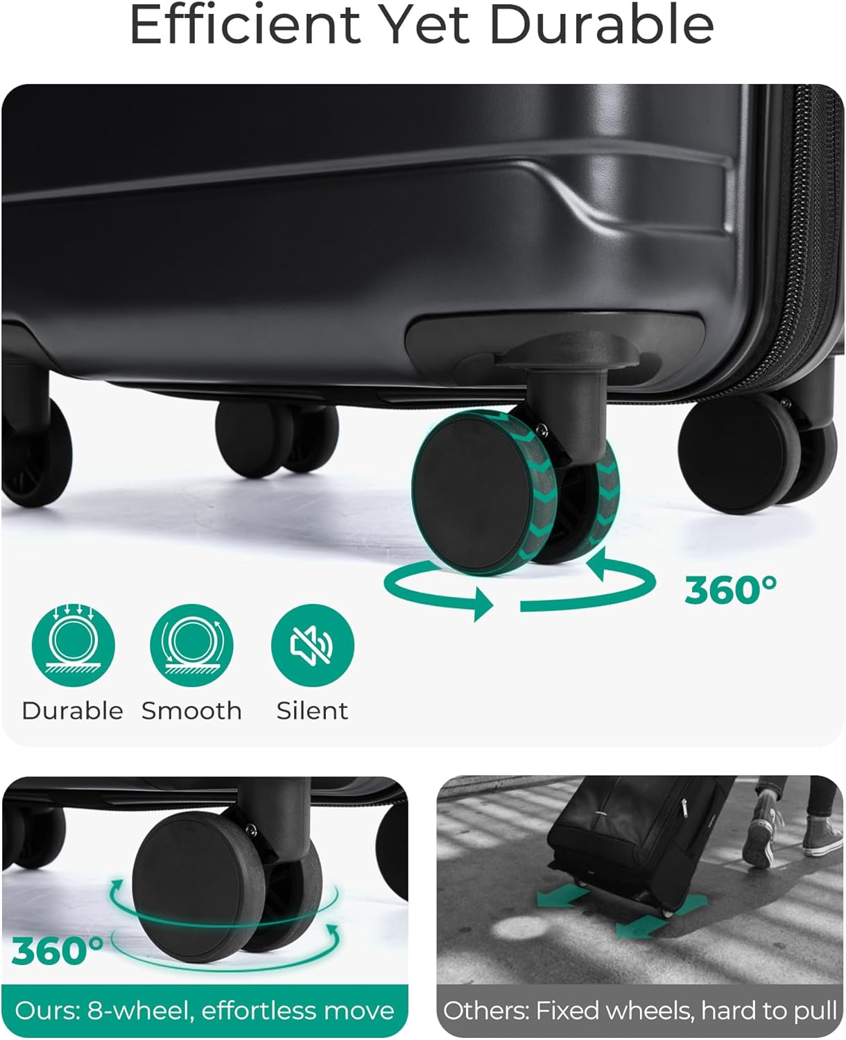 Superior Maneuverability: The rolling suitcase buttery smooth 360° swivel wheels are extremely quiet and durable, making it easy to navigate through airports, train platforms, sidewalks, and even cobblestone streets. The travel luggage has been upgraded with a sturdy and smooth four-level adjustable aluminum handle with multiple height options for your comfort. Soft silicone handles on the top and sides of the hard shell suitcases have been added to make the lightweight suitcase easier to lift