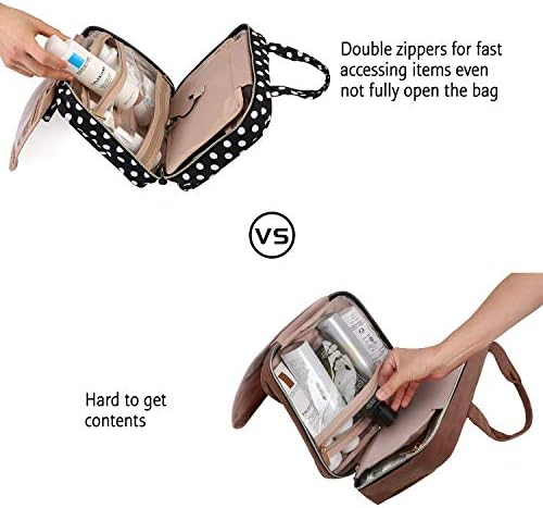 Special Design – Inner main pockets with elastic straps hold bottles upright; Double zipper compartment for easy access the items even not full-opened the bag; Transparent sides for providing clear overview of contents