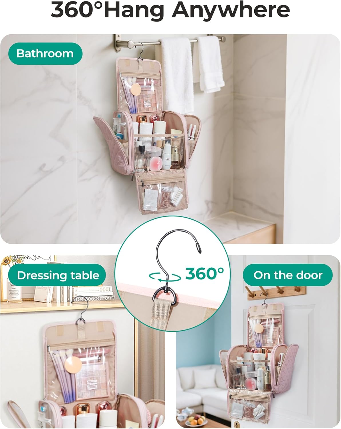 【Convenient Design】: The inner pockets are equipped with elastic straps to securely hold bottles upright, and the transparent zipper pockets allow for easy visibility and access to items without the need to open them. The customized metal zipper closure ensures a smooth and effortless pull, while the 360-degree rotatable and foldable anti-slip metal hook offers versatile hanging options. Additionally, the top handle allows for convenient carrying.