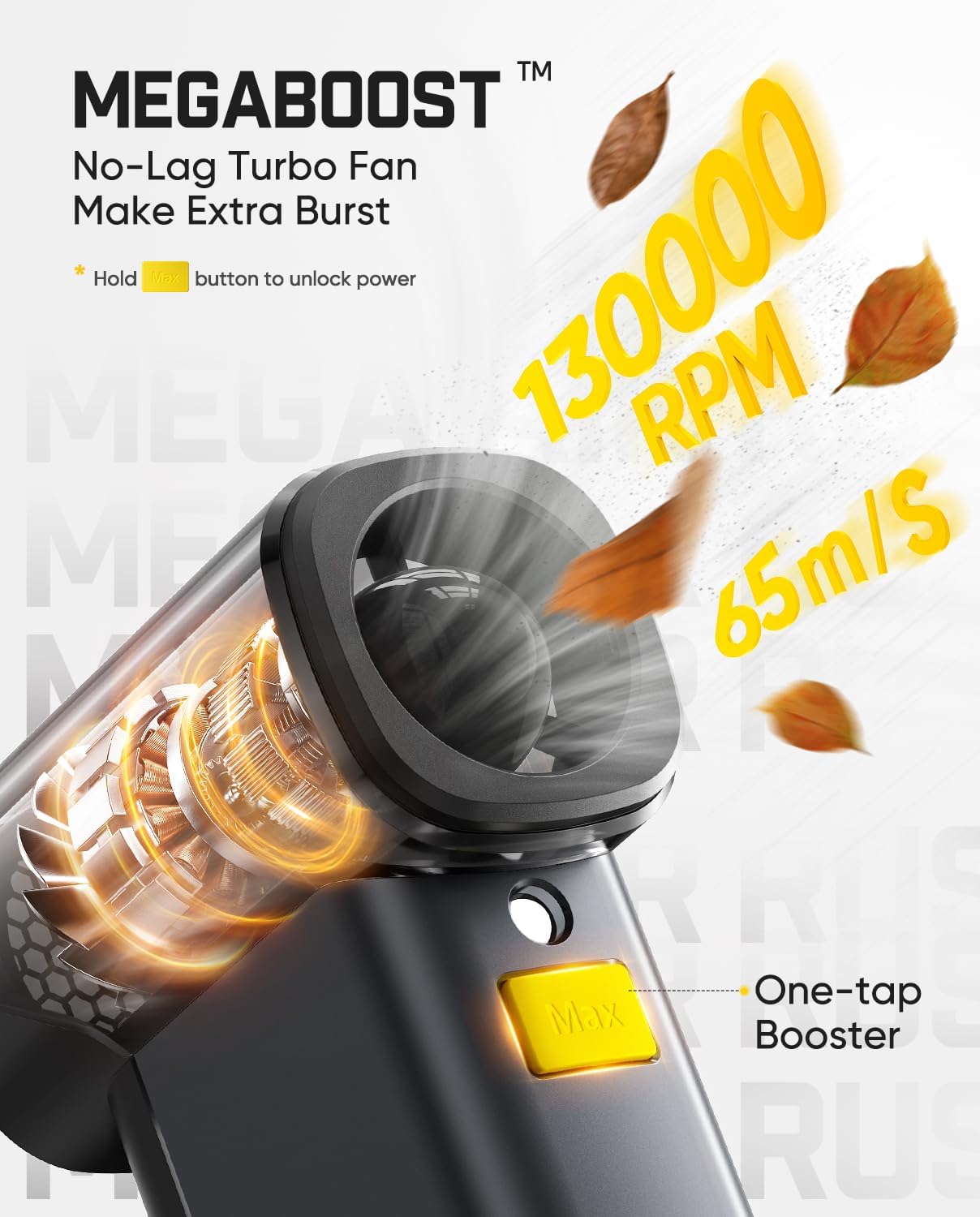 Powerful Performance: Whether it’s dust in electronic devices, particles on a workbench, or grit in modular keyboards, Fanttik air duster’s 130000 RPM brushless motor does it all. With 6 levels, this cordless air duster goes from light dust removal to high-speed cleaning at 65 m/s. Need instant power? Activate MegaBoost One-Tap Booster for a burst of airflow