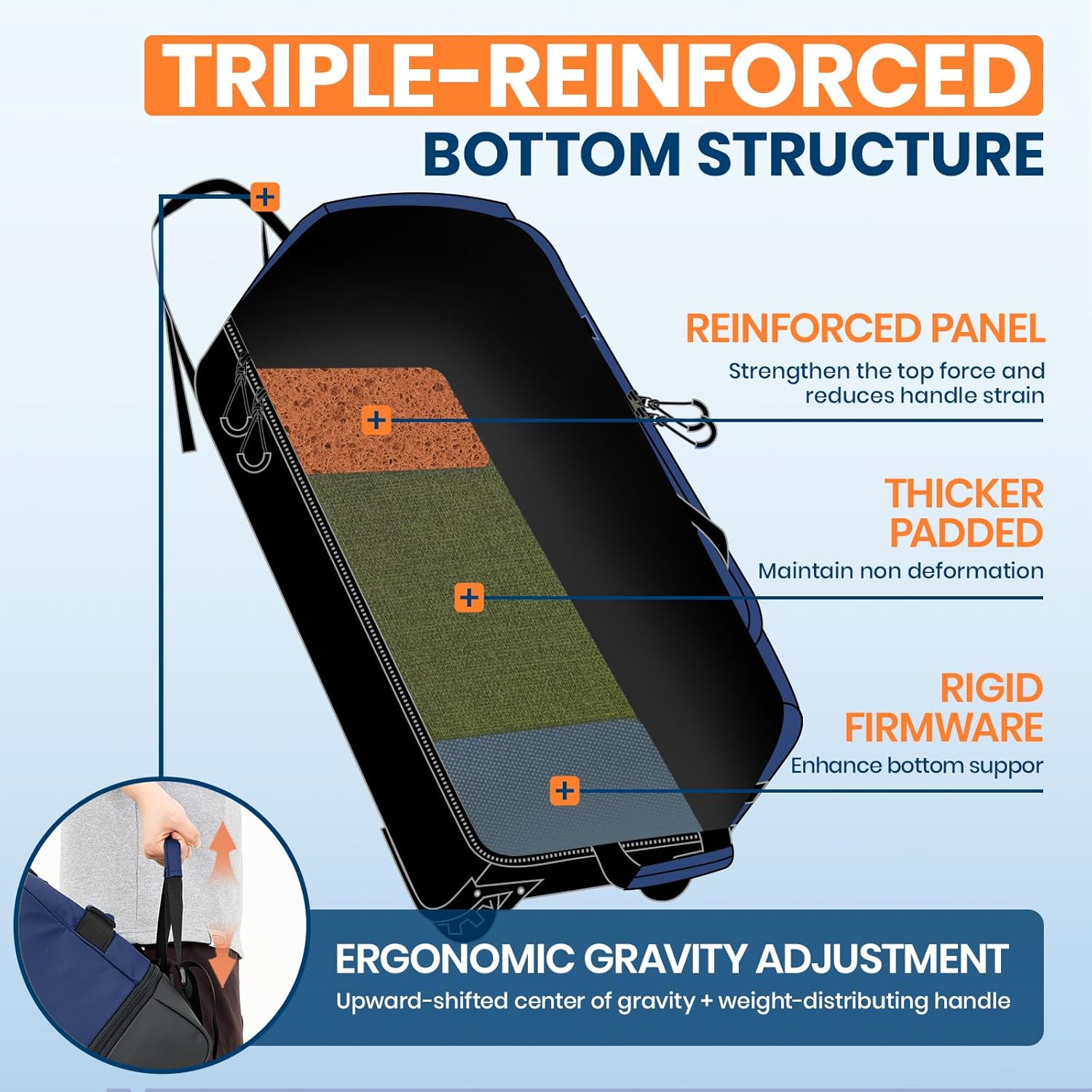 Stable Travel Assistant: This duffel bag redefines design with innovation, upgrading the support structure to prevent deformation.Why is it more trustworthy? Its triple-reinforced bottom ensures firmness when fully loaded, solving common sagging and dragging issues. Ergonomically adjustable handle connect to the reinforced base, enhancing load-bearing capacity, shifting the center of gravity upward, and distributing weight for effortless. Let you easily pull in the most comfortable posture
