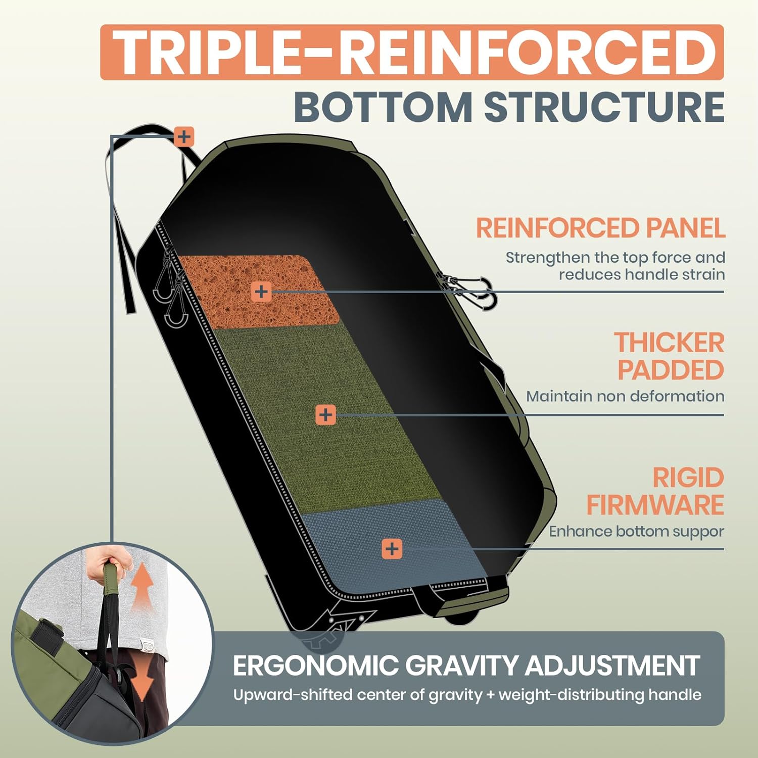 Stable Travel Assistant: This duffel bag redefines design with innovation, upgrading the support structure to prevent deformation.Why is it more trustworthy? Its triple-reinforced bottom ensures firmness when fully loaded, solving common sagging and dragging issues. Ergonomically adjustable handle connect to the reinforced base, enhancing load-bearing capacity, shifting the center of gravity upward, and distributing weight for effortless. Let you easily pull in the most comfortable posture