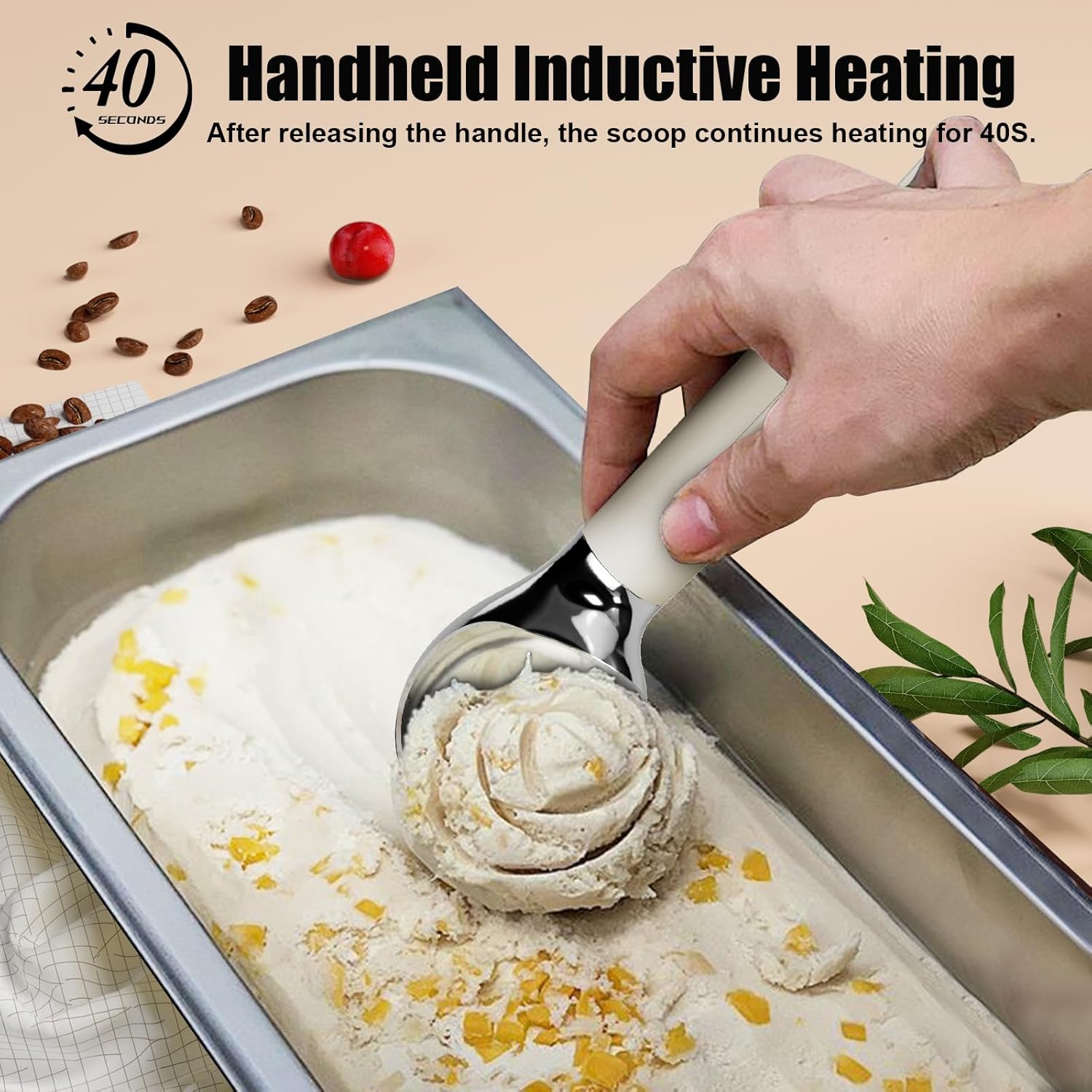 【Creative Heating Design】 This professional ice cream scoop features a grip sensor that activates the heating as soon as you lift it. It heats quickly to ensure smooth and even scooping every time. Avoid touching the scoop head when it reaches over 140°F to prevent burns. After use, let the scoop cool before placing it on wooden kitchen tools.