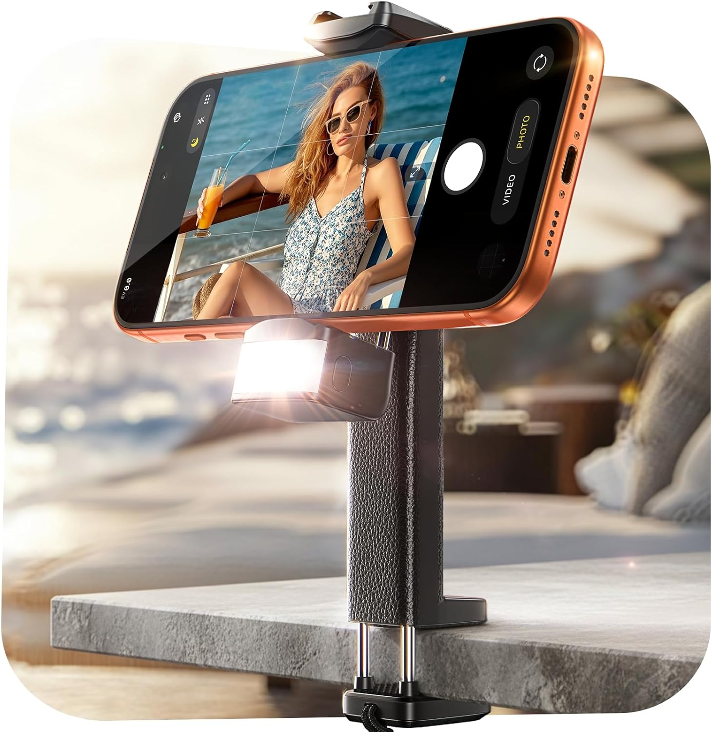Travel Light, Save 75% on Space: This Airplane Phone Holder integrates a fill light, strap, microphone port, and universal tripod mount. It securely attaches to various surfaces like suitcase handles, tray tables, desks, chairs, headboards, books, or mug handles. It also doubles as a portable selfie stick for vlogging—perfect for on-the-go, clip-and-use convenience during your travels.