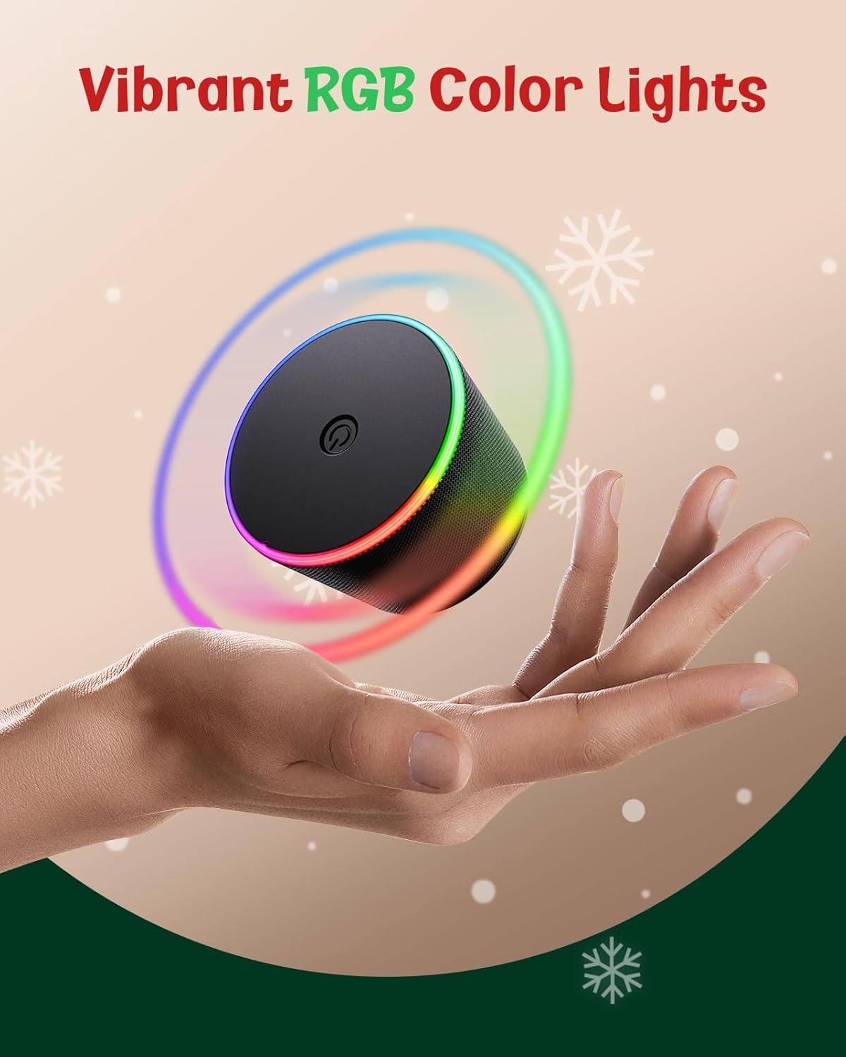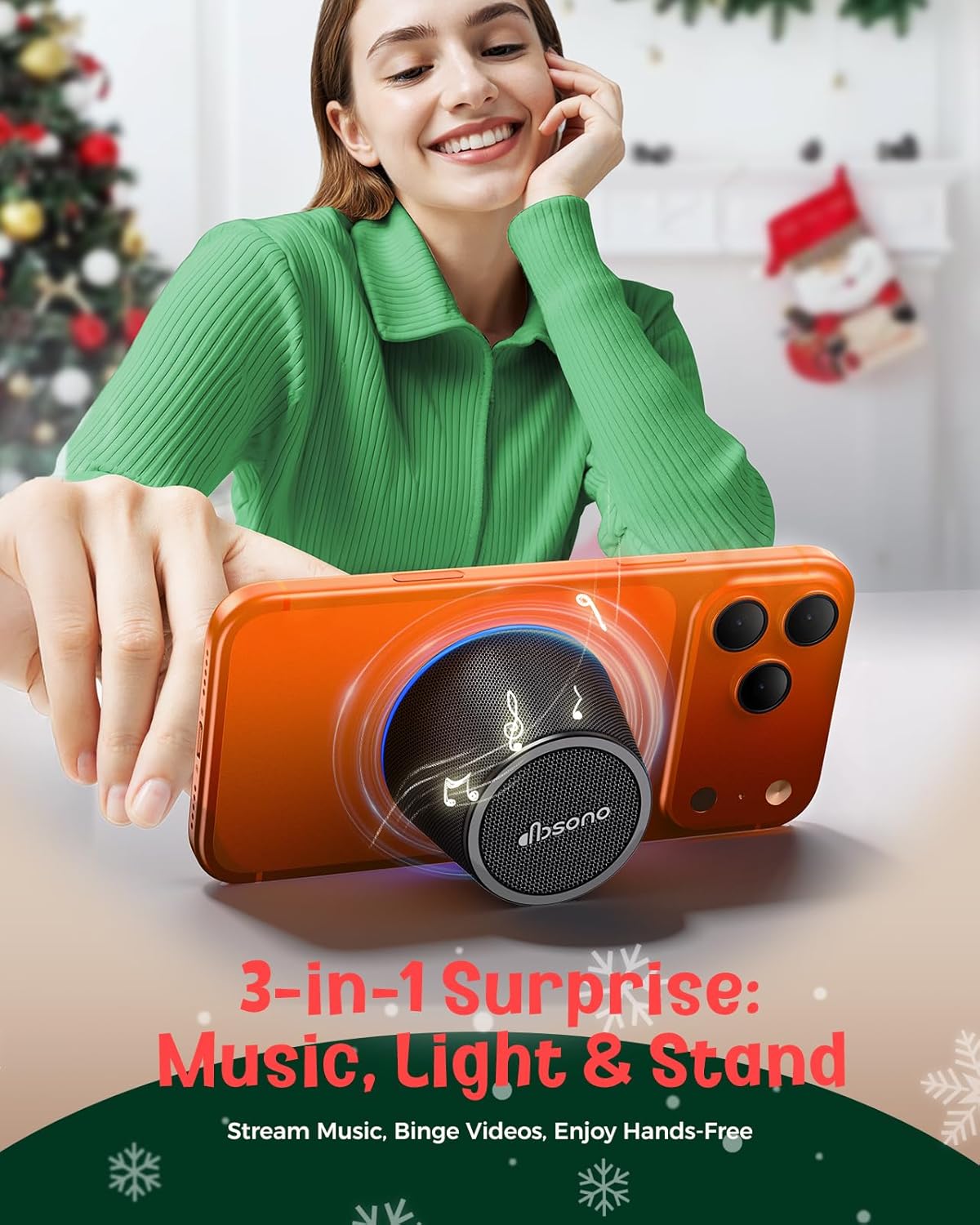 Cell Phone Stand & 9-Mode Color Lights: This portable bluetooth speaker can be directly attached to the back of a phone and doubles as a handy phone stand for hands-free Christmas movie nights; Switch between 9 colorful light modes with one tap—ignite the party or create a cozy vibe instantly. Compact enough to tuck into any stocking stuffers, it’s a 3-in-1 surprise: music, lights, and stand functionality
