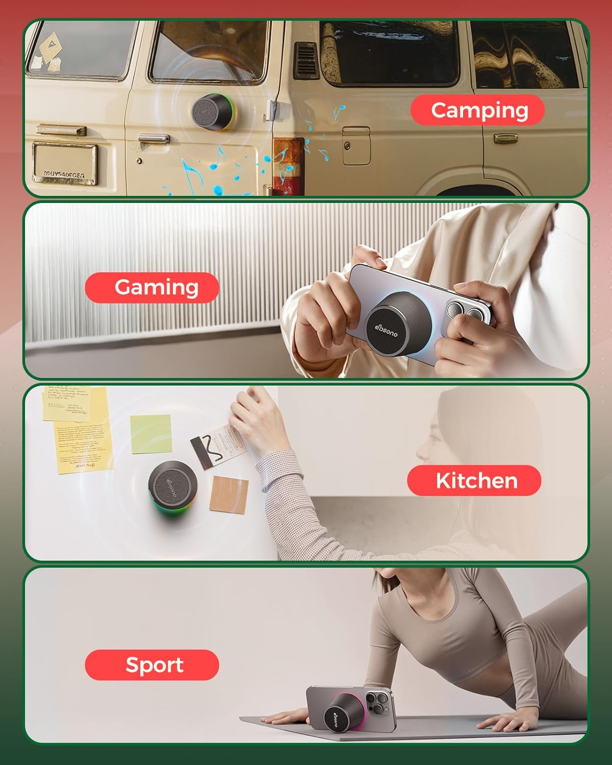 Stick On Sound Anywhere: This blue tooth speaker attaches directly to metal surfaces like refrigerators, ovens, or car doors. It can also serve as a phone holder by attaching to the back of your phone. Included are two metal rings; use them if needed for a better fit. Perfect for Christmas parties, baking in the kitchen, or traveling, this speaker lets technology light up the festive atmosphere. Enjoy great sound anytime, anywhere