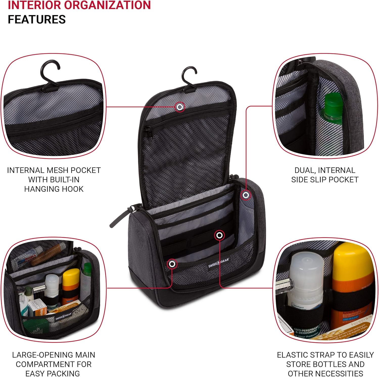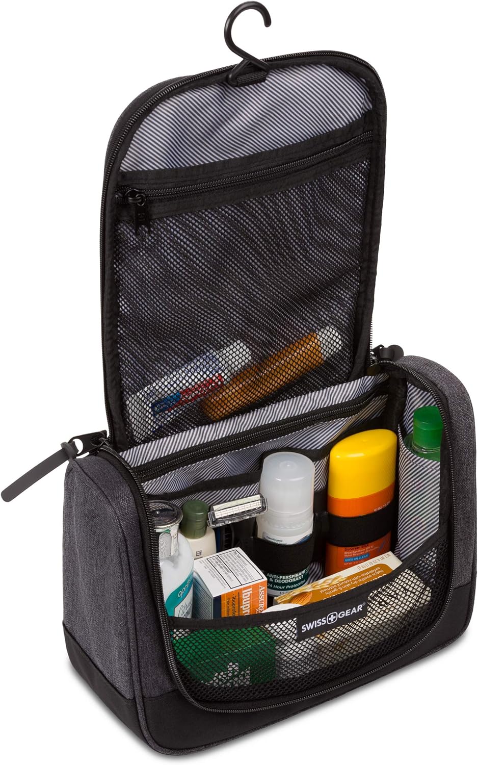 Modernize your travels with the SwissGear 2379 Hanging Toiletry Kit. Unzip its horseshoe opening and organize your travel-sized bottles in its internal elastic strap system and integrated zip pocket. Lay smaller things within its center compartment, which contains a mesh barrier to keep liquids from spilling over. And find two convenient side slip pockets for your razor and other small but important necessities. And save valuable countertop space by using the built-in hanger hook.