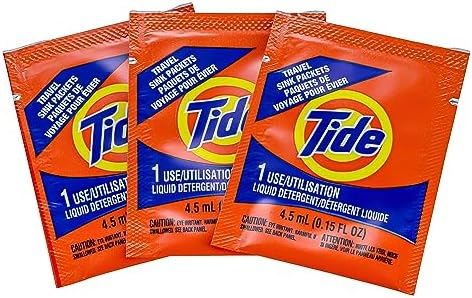 Tide Travel Sink Packets have just enough Tide liquid detergent to wash a few items in the sink when traveling. Includes 3 Packets – each just enough for a sink full of suds.