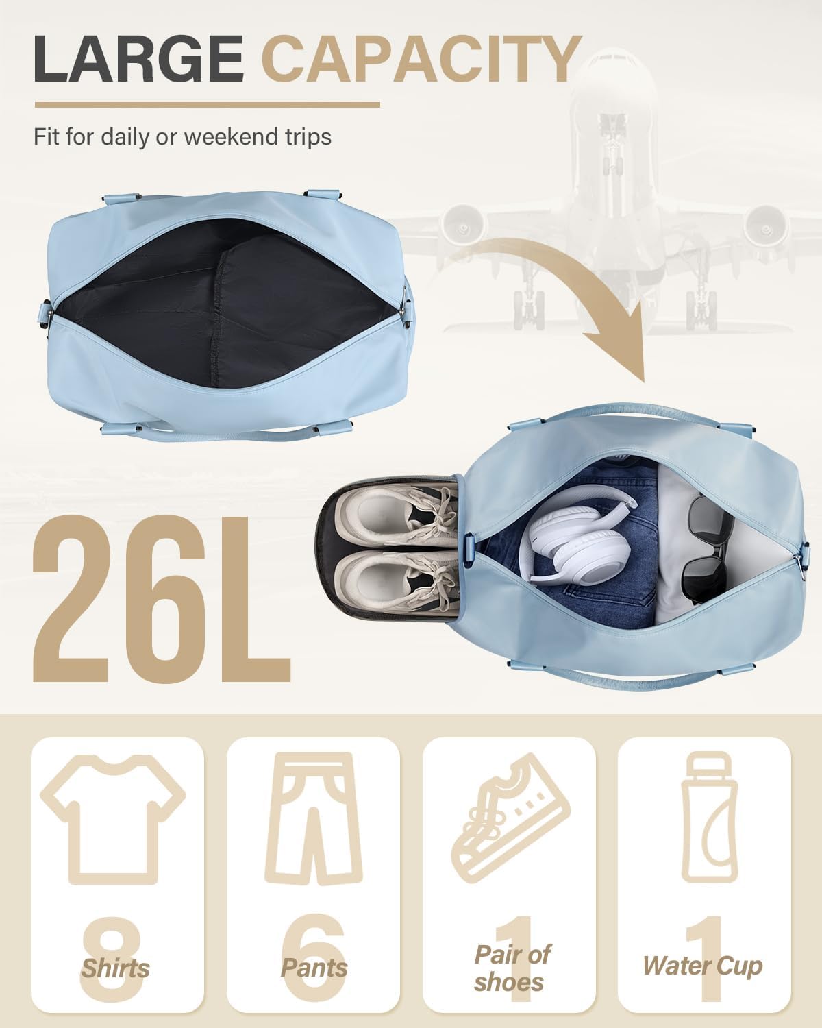 Roomy and Organized: Stop rummaging through your bag you can find what you’re looking for effortlessly!The large travel bag with a generous 26L capacity and 7 pockets inside and out, making it perfect for holding 1-7 day’s worth of travel essentials. Our duffle bags feature 1 spacious main compartment including 1 large zip pocket and 2 partitioned pockets for frequently needed items. A separate zip space for your shoes.