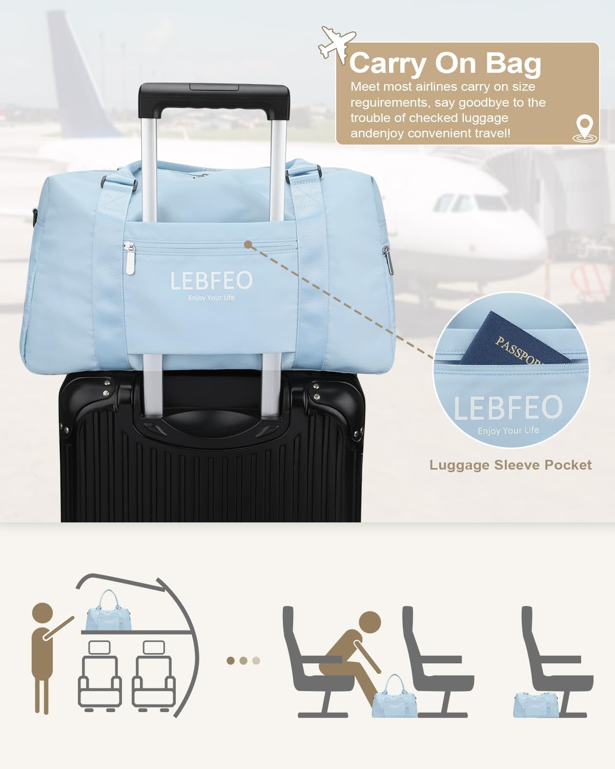 Airplane Friendly Travel Bag: Say goodbye to the concerns of checked baggage and hello to convenient travel! Our travel bags measuring 19*8*10.5 inches(excluding the handle) meet most carry on bags for airplanes. It fits easily in overhead compartments or as an underseat personal item travel bag. Our travel duffel bags have luggage sleeves that let you slip them over your suitcase. The front zippered pocket keeps your necessary items like a passport close at hand for easy access